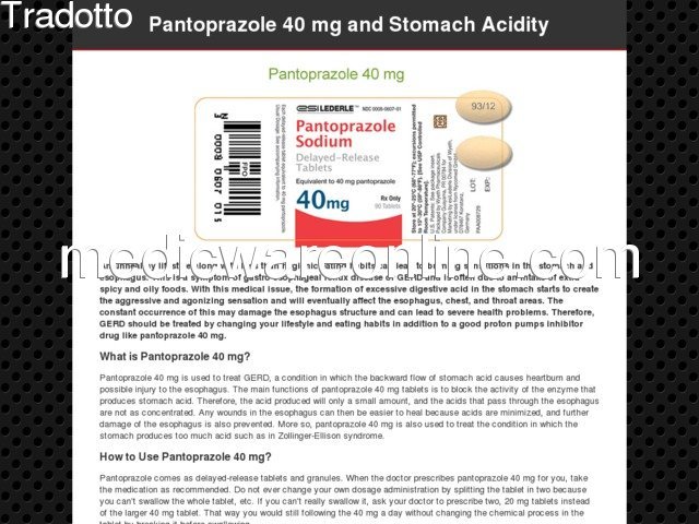 Pantoprazolo 40 mg Informazioni - Gastro esofageo malattia da reflusso (GERD) è la principale causa di un'eccessiva produzione di acido nello stomaco. La produzione di acido può essere ridotto o interrotto da un inibitore di pompa protonica come pantoprazolo 40 mg.